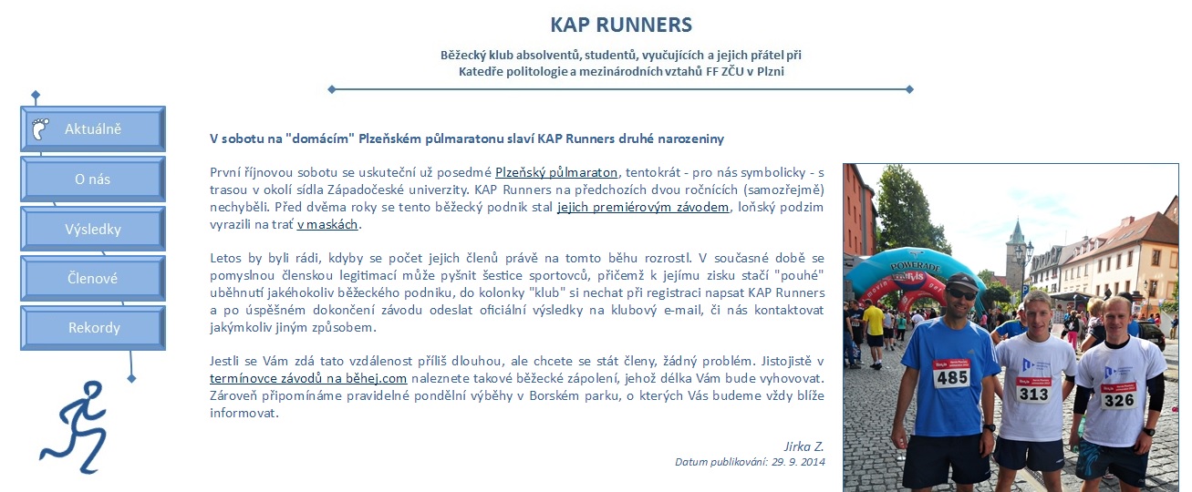 ![]() KAP Runners v novém hávu Se začátkem nového akademického roku jsme nadělili našemu běžeckému uskupení předčasný dárek k jeho blížím se čtvrtým narozeninám. Padlo totiž rozhodnutí, že přeměníme design webu KAP Runners. ![]() Zhodnocení nových stránek necháme samozřejmě na Vás. Budeme se těšit na Vaše případné připomínky a reakce, které nám můžete posílat na e-mail kap.runners@gmail.com či prostřednictvím Facebooku. Budeme rádi za jakoukoliv zpětnou vazbu a doufáme, že na první pohled neobjevené "mouchy" internetových stránek KAP Runners se nám podaří brzy odstranit... Sportu zdar a běhu zvláště! Jirka Z.